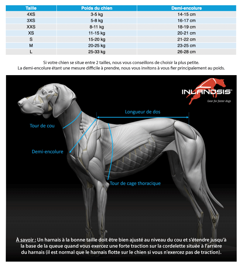 • Pour les chiens très élancés (type Lévrier), privilégiez une taille en dessous de la recommandation standard.