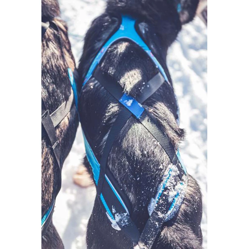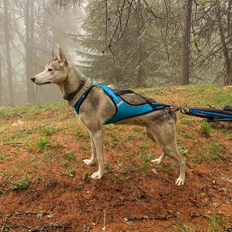 - Stabilité et transfert de puissance exceptionnels grâce à la forme enveloppante et au support de cage thoracique pré-formé : le chien est calé et peut s’appuyer de manière franche dans le harnais, dans l’axe mais aussi latéralement